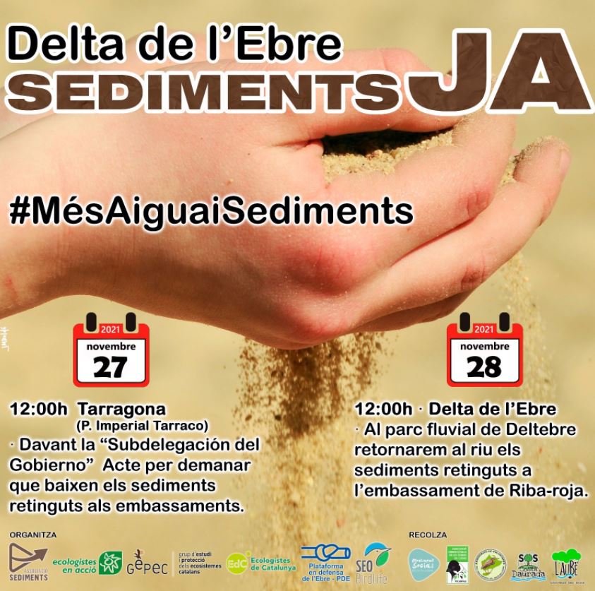 Associació Sediments Ja, Plataforma en Defensa de l’Ebre, Gepec, Ecologistes en Acció, Seo Bird Life amb el recolzament de Associació de Voluntaris del Parc Natural del Delta de l’Ebre, Picampall, L’Aube, SOS Costa Daurada i Moviment Social Delta de l’Ebre