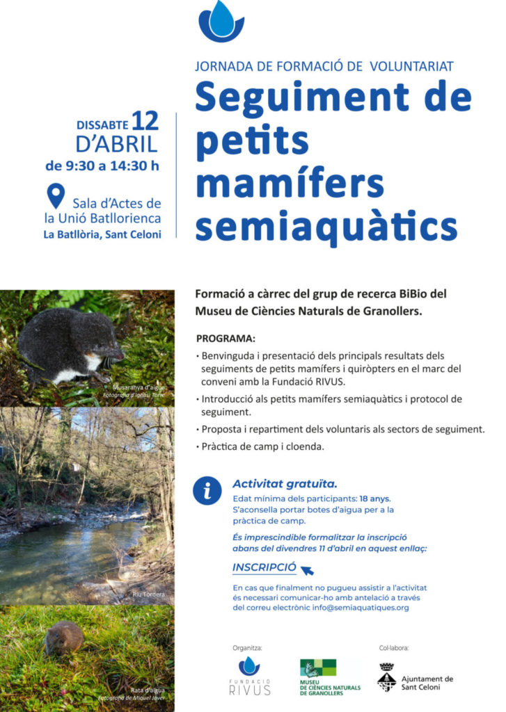 El grup de recerca BiBio del Museu de Ciències Naturals de Granollers i la Fundació RIVUS, amb la col·laboració de l’Ajuntament de Sant Celoni, han organitzat per a aquest dissabte, 12 d’abril, una jornada de formació de voluntariat per al “Seguiment de petits mamífers semiaquàtics (SEMSA)”.