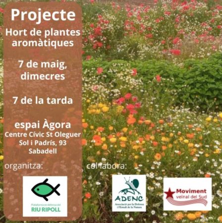 Projecte Hort de plantes aromàtiques dimecres 7 de maig 19:00h - dissabte 7 de juny 21:00h Espai Agora Sabadell Formació Plataforma en Defensa del riu Ripoll Contacte: correu@adenc.cat Informació Ubicació Vine el 7 de maig a les 19 h a l'Espai Agora de Sabadell. Iniciem un nou projecte per enfortir els terrenys del riu de manera positiva per al seu entorn natural. Us donem detalls el proper dia 7 de maig a les 19 h a l’Espai Agora de Sabadell. No hi falteu! Compartir: Espai Agora Sabadell Vallès Occidental