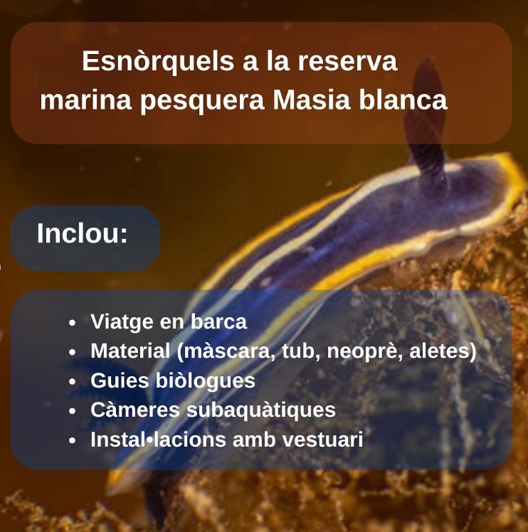 Sortida en barca per a fer immersions d'esnorquel guiades amb l'objectiu de reportar la biodiversitat marina a la Reserva Natural de Masia Blanca.