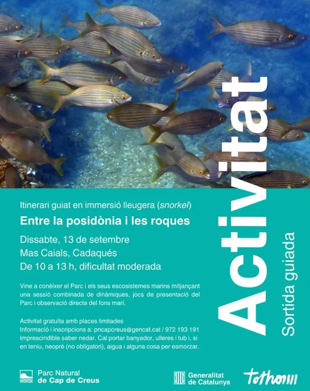 Aquest dissabte 13 de setembre, t’esperem per a una sortida guiada de snorkel entre posidònia i roques. Una experiència única per conèixer la biodiversitat marina del Parc Natural de Cap de Creus!