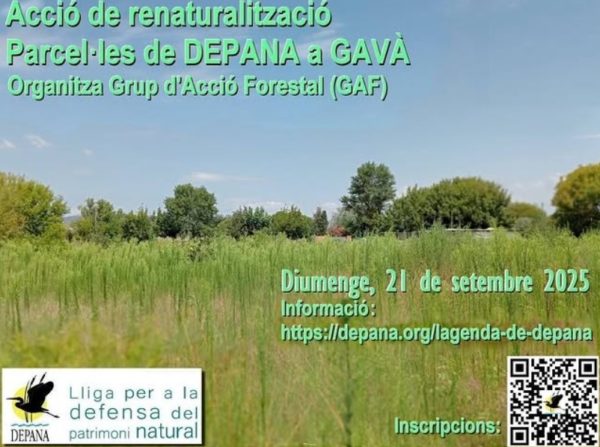 T’esperem diumenge 21 de setembre (10 h–13.30 h) a les parcel·les de DEPANA al Camí de la Pineda (Gavà) per participar en una activitat oberta a tothom i de nivell fàcil, on col·laborarem en la renaturalització d’un espai de 13.200 m² als límits del Parc Agrari del Baix Llobregat amb tasques de retirada de deixalles, control de flora invasora, mesura de l’aigua i plantació d’espècies autòctones.