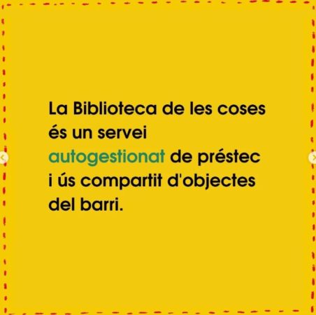 La Biblioteca de les Coses permet l’accés per part del veïnat a objectes dels que se’n sol fer un ús esporàdic. No cal comprar-los, sinó que els podem compartir: un trepant, una panificadora o una màquina de cosir. Ens hem acostumat a acumular objectes a casa que gairebé no fem servir, però ocupen espai, costen diners i acabaran esdevenint residus.