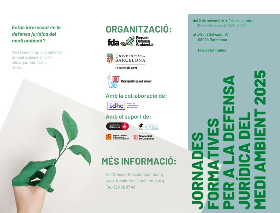 El Fons de Defensa Ambiental (FDA) organitza una nova edició de les Jornades Formatives per a la Defensa Jurídica del Medi Ambient, que tindran lloc del 3 de novembre a l’1 de desembre de 2025 a la seu de DEPANA (c/ Sant Salvador, 97, Barcelona).