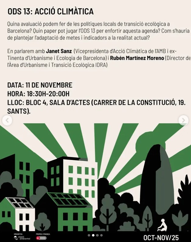 Superilles, habitatge, dret a la ciutat i transició ecosocial. Quin paper pot jugar l’ODS 11 per impulsar aquestes polítiques? Hi ha marge per propostes de millora? Ponent: Lorenzo Vidal. - Sessió 3: ODS 13 (Acció Pel Clima) – Dimarts 11 de novembre a les 18.30 h.