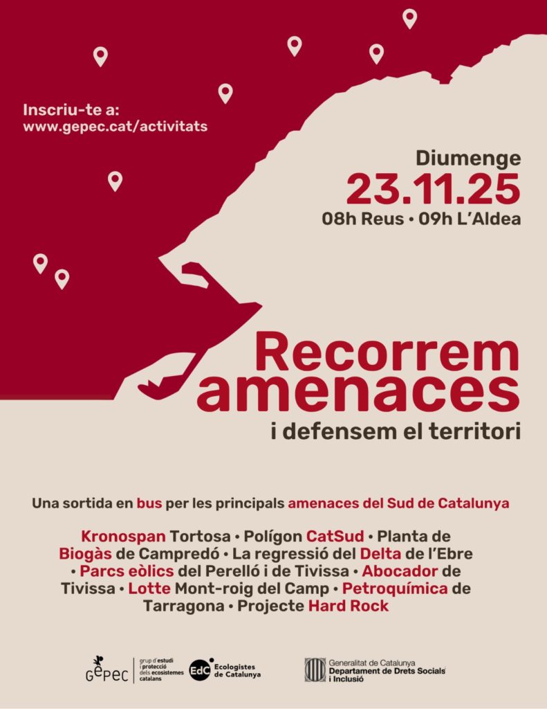 Si tens interès en conèixer de més a prop què està passant, vine i participa d’aquest itinerari en bus on podràs conèixer la situació actual dels impactes ambientals del camp de Tarragona i Terres de l’Ebre.