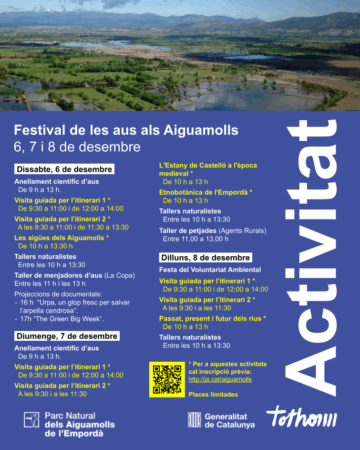 Vine al Festival de les Aus, del dissabte 6 al dilluns 8 de desembre de 2025, al Parc Natural dels Aiguamolls de l'Empordà i gaudeix d’activitats gratuïtes per a tots els públics: visites guiades, tallers naturalistes, anellament d’aus i molt més!