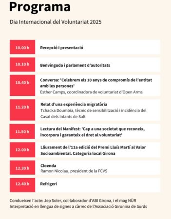 Durant els actes es llegirà el Manifest pel Dia Internacional del Voluntariat 2025: ‘Cap a una societat que reconeix, incorpora i garanteix el dret al voluntariat’, i es donarà a conèixer el nom de les entitats guanyadores de l’11a edició del Premi Lluís Martí al Valor Socioambiental, que aquest any porta per lema ‘Per un present més just i sostenible. Projectes de voluntariat que impulsen la justícia social i la sostenibilitat’.