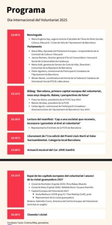 Durant els actes es llegirà el Manifest pel Dia Internacional del Voluntariat 2025: ‘Cap a una societat que reconeix, incorpora i garanteix el dret al voluntariat’, i es donarà a conèixer el nom de les entitats guanyadores de l’11a edició del Premi Lluís Martí al Valor Socioambiental, que aquest any porta per lema ‘Per un present més just i sostenible. Projectes de voluntariat que impulsen la justícia social i la sostenibilitat’.