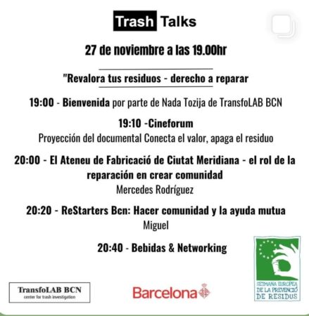 Enguany, les TrashTalks coincideixen amb el tancament de la nostra campanya “Revalora els teus residus: Dret a reparar” i formen part de les activitats de la Setmana Europea de Prevenció de Residus.