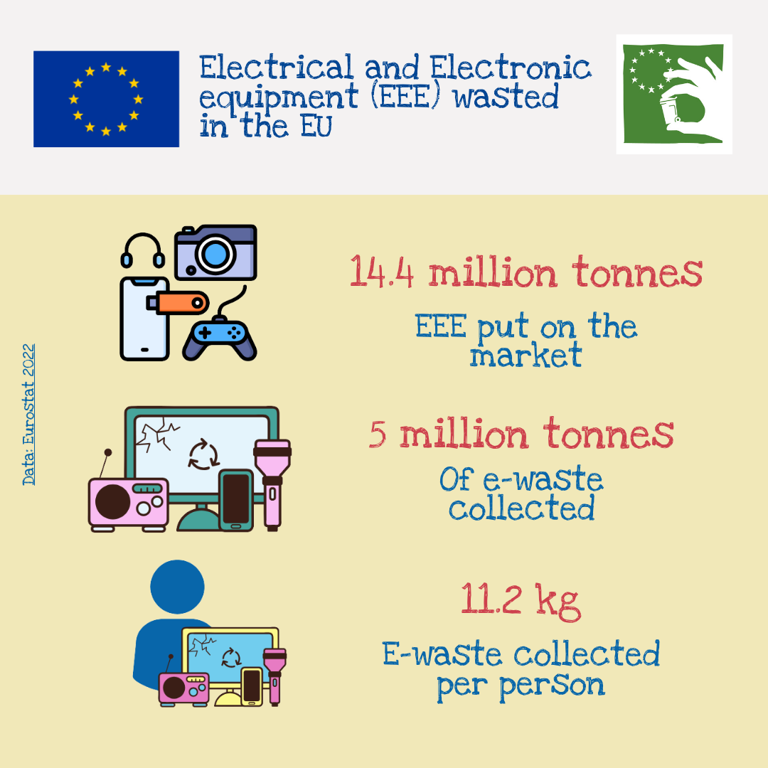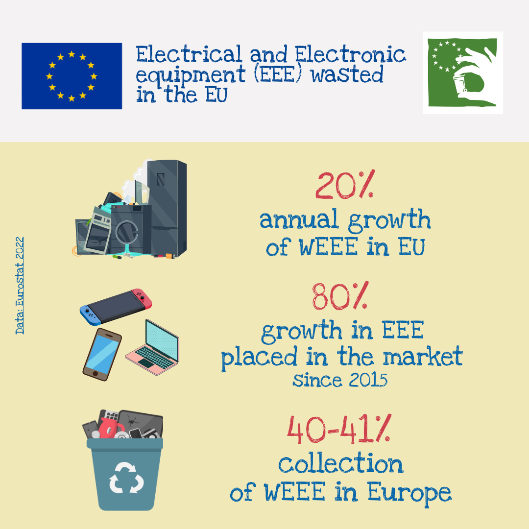 El 2022 es van posar al mercat 14,4 milions de tones d’aquests aparells, i es van recollir 5 milions de tones de residus electrònics (11,2 kg per persona). Tot i això, la quantitat recollida creix principalment perquè també augmenten les vendes dins la UE. Els RAEE són el flux de residus que més ràpidament creix a Europa, amb un increment d’un 2% anual.