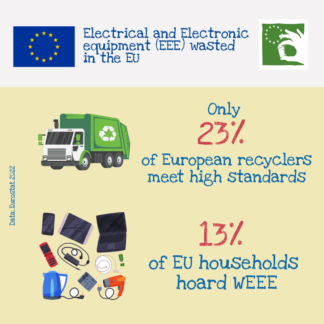 Gairebé la meitat dels RAEE generats encara no es recullen, i la majoria dels estats membres no assoleixen els objectius de recollida establerts per la Directiva europea sobre RAEE. A més, aquesta directiva ha tingut un impacte limitat en la millora del reciclatge i la recuperació de materials: només un 40% dels RAEE es reciclen actualment a la UE.