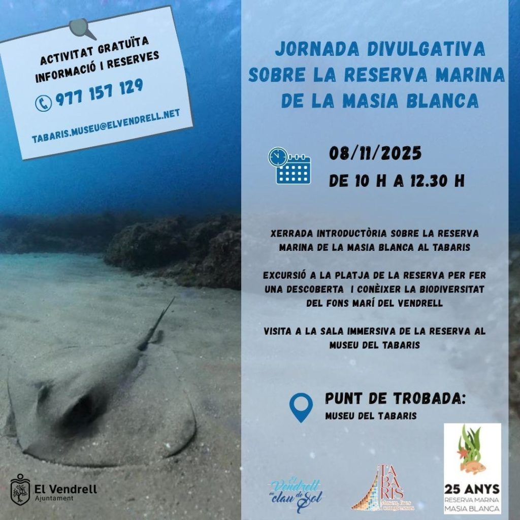 Amb motiu de la celebració del 25è aniversari de la Reserva Marina de la Masia Blanca, el dissabte 8 de novembre es farà una jornada divulgativa oberta a tothom per donar a conèixer la Reserva i la biodiversitat del fons marí del Vendrell. Es farà una activitat de descoberta a la platja de la Reserva, en què s’observaran i identificaran les restes marines trobades a la sorra i es relacionaran amb la vida que hi ha al mar del Vendrell.