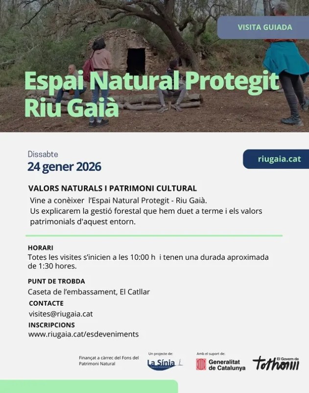 Farem un recorrecut per l’Espai Natural Protegit – Riu Gaià per explicar-vos la gestió forestal que durem a terme i els valors patrimonials d’aquest entorn. Dia: 24/01/2026 Hora: 10 h Punt de trobada: Caseta de l’embassament, el Catllar Participació gratuïta amb grups reduïts. visites@riugaia.cat