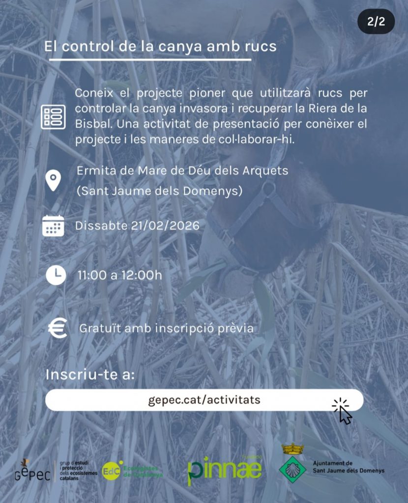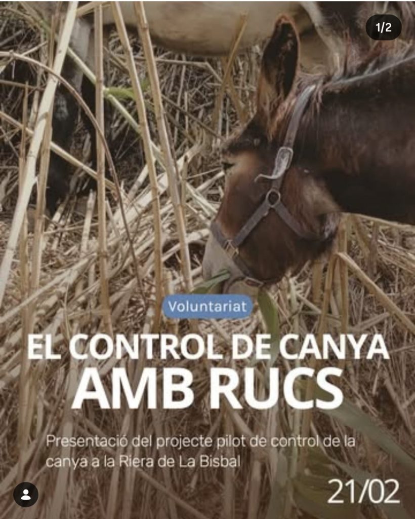 Aquest projecte neix de la necessitat d’identificar i implementar tècniques alternatives i sostenibles per al control del rebrot de la canya americana després de les actuacions de desbrossada mecànica a la Riera de la Bisbal. Aquesta espècie invasora representa una amenaça important per a la biodiversitat fluvial i per al bon estat ecològic del bosc de ribera. L’objectiu principal del projecte és avaluar l’eficàcia de la pastura controlada de rucs com a eina de gestió de la vegetació invasora, afavorint la recuperació i consolidació de la vegetació autòctona.