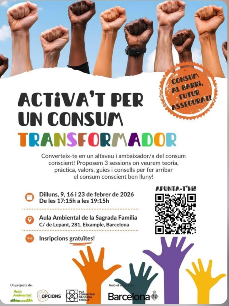 Torna la formació gratuïta en consum responsable a Sagrada Família, una formació pràctica per passar a l’acció i ajudar a multiplicar el canvi al teu entorn. Consta de tres sessions per convertir-te en agent divulgador/a: consum, comunicació i alternatives reals al barri.