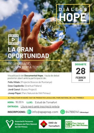 Visualització del Documental HOPE (La gran oportunidad) i taula de debat oberta amb la participació de les entitats Projecte Boscos de Muntanya, Gratitud Pallars, i Buseu Project i el Parc Natural de l’Alt Pirineu)