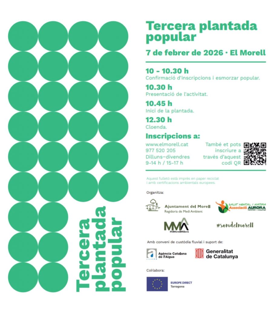 El proper dissabte 7 de febrer, l’Ajuntament del Morell i l’Associació Aurora, organitzem la 3a Plantada Popular que tindrà lloc a l’àrea de la Granja dels Frares.