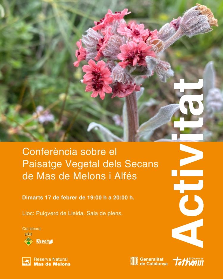 El proper dimarts 17 de febrer, de 19:00 h a 20:00 h, la Sala de plens de Puigverd de Lleida acollirà la xerrada de Joan Cartanyà (Reboll) sobre la sorprenent flora i adaptacions de l’Espai Natural dels secans de Mas de Melons i Alfés.