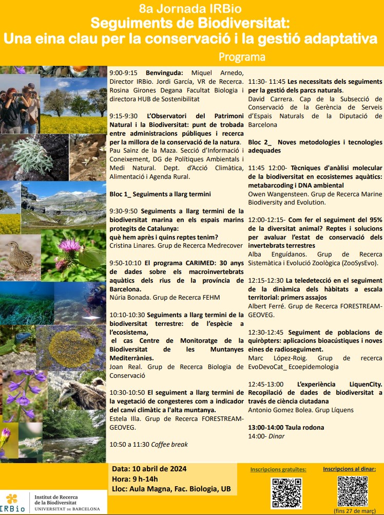 En aquesta jornada, volem donar a conèixer el treball entorn els seguiments i la gestió de la conservació que fan els grups de recerca vinculats a l’IRBio. Durant la jornada es presentaran diferents treballs de seguiments en ecosistemes marins, terrestres i d’aigua dolça, així com noves metodologies i diferents tecnologies que permeten uns treballs més acurats.