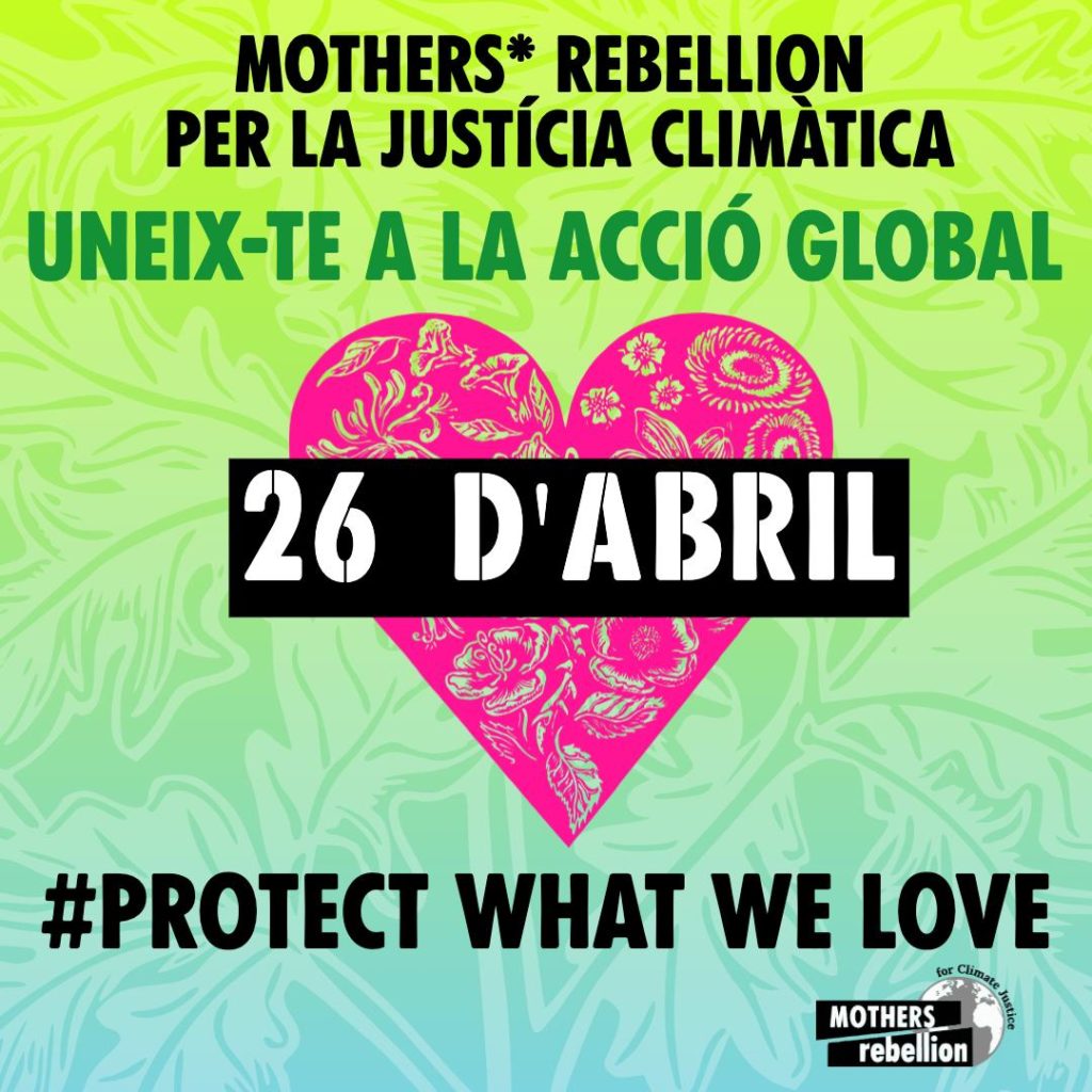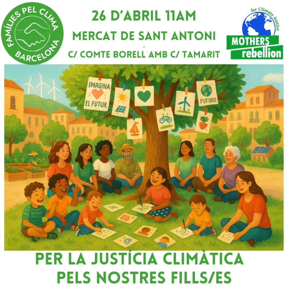El 26 d’abril a les 11h serem al Mercat de Sant Antoni (C/ Comte Borrell amb Tamarit) per formar part de la Mother’s Rebellion, una protesta asseguda per mares, pares i famílies que defensem els drets dels infants davant la crisi climàtica.