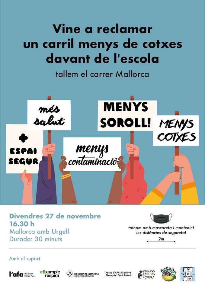 Vine avui, a les 16:30 h, vine a tallar el carrer Mallorca per reclamar un carril menys de cotxes davant de l’escola  Auró.