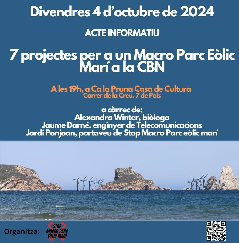 Informarem dels diversos projectes que s’han presentat fins al moment per construir una gran infraestructura de renovables al golf de Roses i la badia de Pals, en especial del darrer projecte promogut per REPSOL que contempla ubicar 76 aerogeneradors de 413 m d’altura al Golf de Roses i la Badia de Pals i passar la línia d’evacuació de Molt Alta tensió aèria per aquest municipi i tot el Baix Empordà fins a arribar al Gironès.