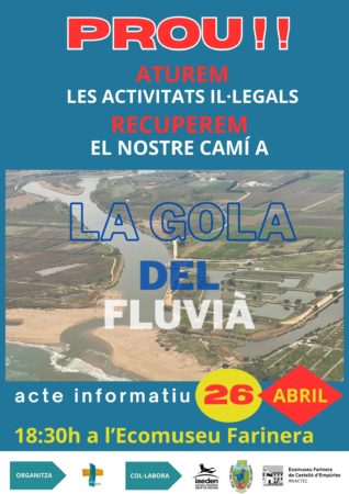 Diem PROU! El pròxim 26 d’abril, el Grup Gola del Fluvià conjuntament amb l’IAEDEN i l’APNAE faran un acte informatiu sobre la recuperació del camí de la Gola del Fluvià. L’acte tindrà lloc a l’Ecomuseu Farinera de Castelló d’Empúries a les 18:30 h.