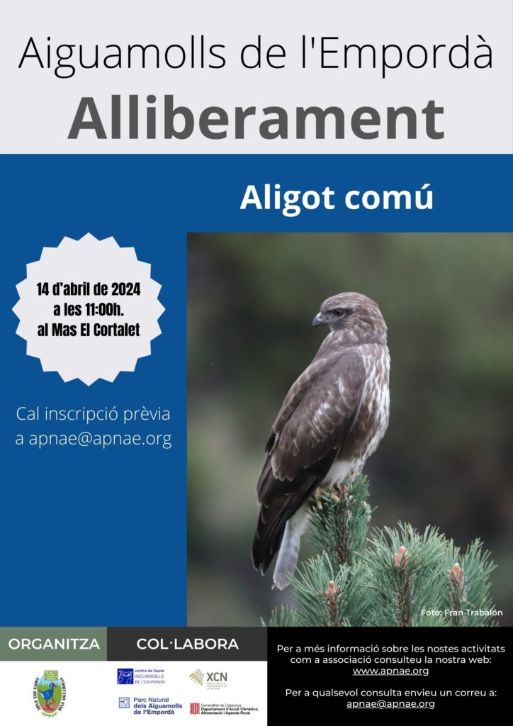 Es farà un alliberament d’un Aligot comú (Buteo buteo) que ha estat recuperat de les seves lesions al Centre de Fauna dels Aiguamolls de l’Empordà i coneixerem de ben a prop la tasca que fan els voluntaris i l’equip de professionals del Centre.