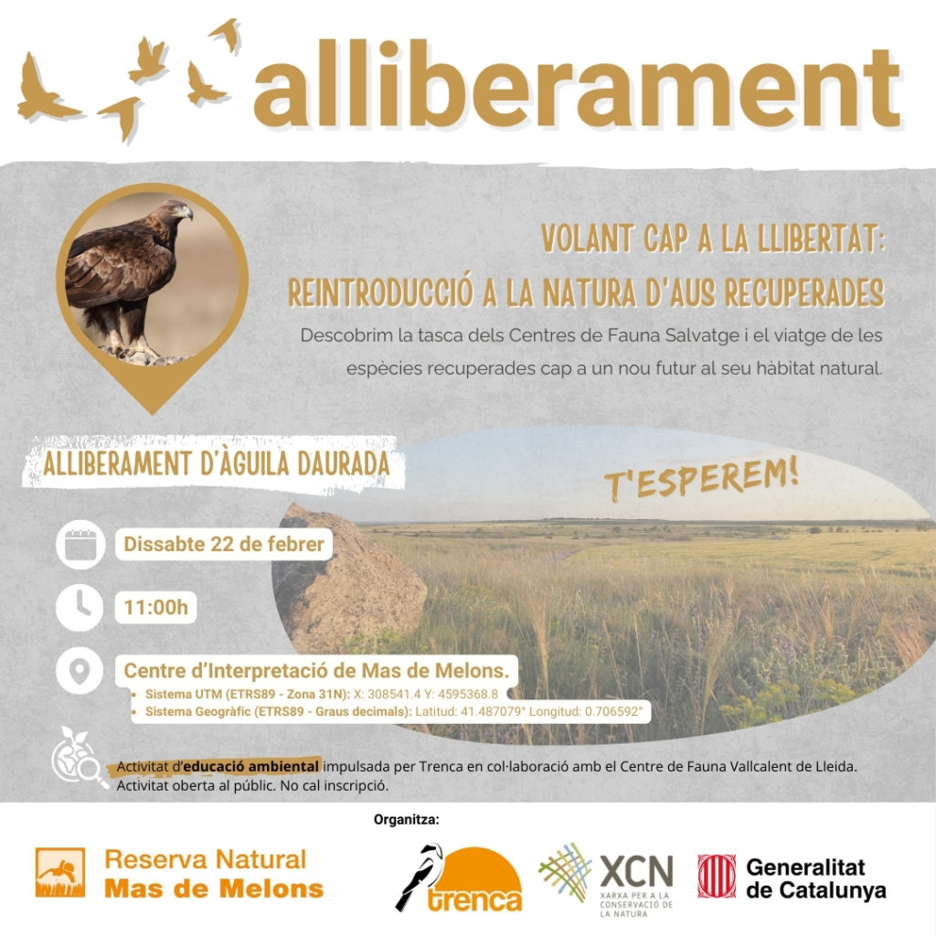 Uneix-te a nosaltres en un esdeveniment molt especial: l’alliberament d’una àguila daurada recuperada! Descobreix el treball dels Centres de Fauna Salvatge i acompanya’ns en aquest moment únic, on aquesta majestuosa au tornarà al seu hàbitat natural.