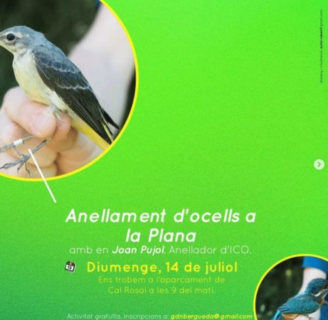 Anellament d’ocells a la Plana, amb en Joan Pujol, anellador de l’ICO. Hora i punt de trobada: a les 9 del matí a l’aparcament de cal Rosal.