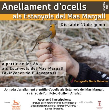 Anellament d’ocells als Estanyols de Mas Margall dissabte 11 de gener 2025 08:00h fins 13:00h Estanyols de Mas Margall Avinyonet de PuigVentós Formació Voluntariat IAEDEN - Salvem l'Empordà Contacte: iaeden@iaeden.cat Informació Ubicació El dissabte 11 de gener tornem-hi Jornada d’anellament científic d’ocells als Estanyols del Mas Margall. A càrrec de l’ornitòleg Guillem Arrufat No us ho perdeu Inscripcions escrivint a iaeden@iaeden.cat o trucant al 972 670531 Compartir: Estanyols de Mas Margall Avinyonet de PuigVentós Alt Empordà