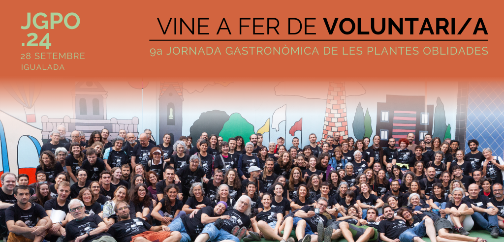 28 setembre 2024 - 9a Jornada Gastronòmica de les Plantes Oblidades T’agrada la Jornada Gastronòmica de les Plantes Oblidades? Vols contribuir a fer-la possible des de dins? Voluntari/a, no hi fots faltar! El dia 28 de setembre del 2024 tindrà lloc la 9ª edició de la Jornada Gastronòmica de les Plantes Oblidades, però per fer-la possible calen més de 180 voluntaris i voluntàries, sense els quals la Jornada no seria possible.
