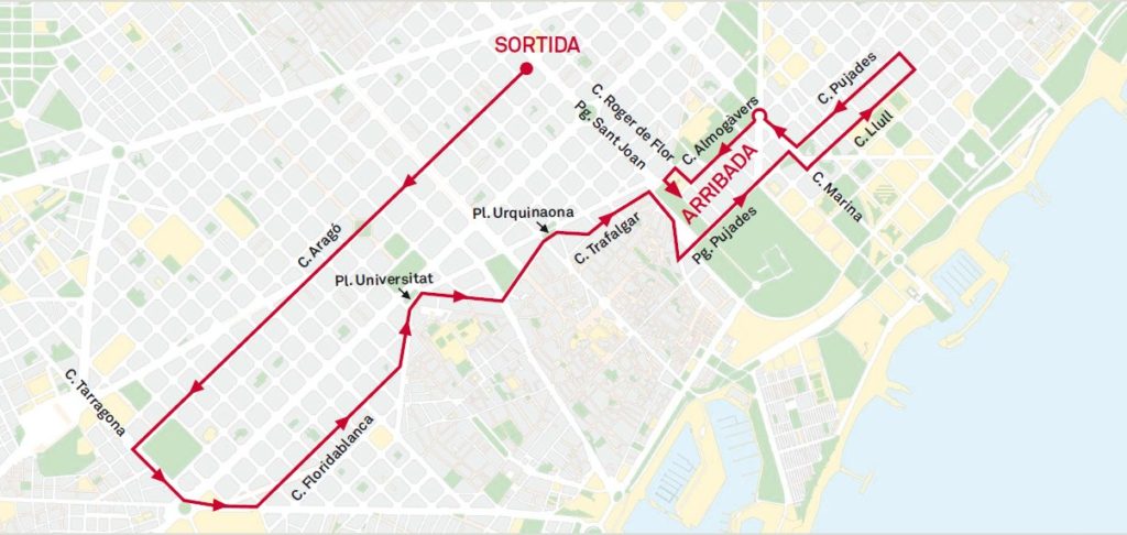 Amb sortida al carrer Aragó seguirà pel carrer de Tarragona, plaça d’Espanya, avinguda del Paral·lel en sentit contrari, carrer de Floridablanca, ronda de Sant Antoni, plaça de la Universitat, carrer de Pelai, plaça de Catalunya, carrer de Fontanella, plaça d’Urquinaona, carrer de Trafalgar, passeig de Lluís Companys, carrer del Comerç, passeig de Picasso, passeig de Pujades, carrer de la Marina, carrer de Lull, carrer de Badajoz, carrer dels Almogàvers, carrer de Roger de Flor, avinguda de Vilanova i passeig de Lluís Companys novament.
