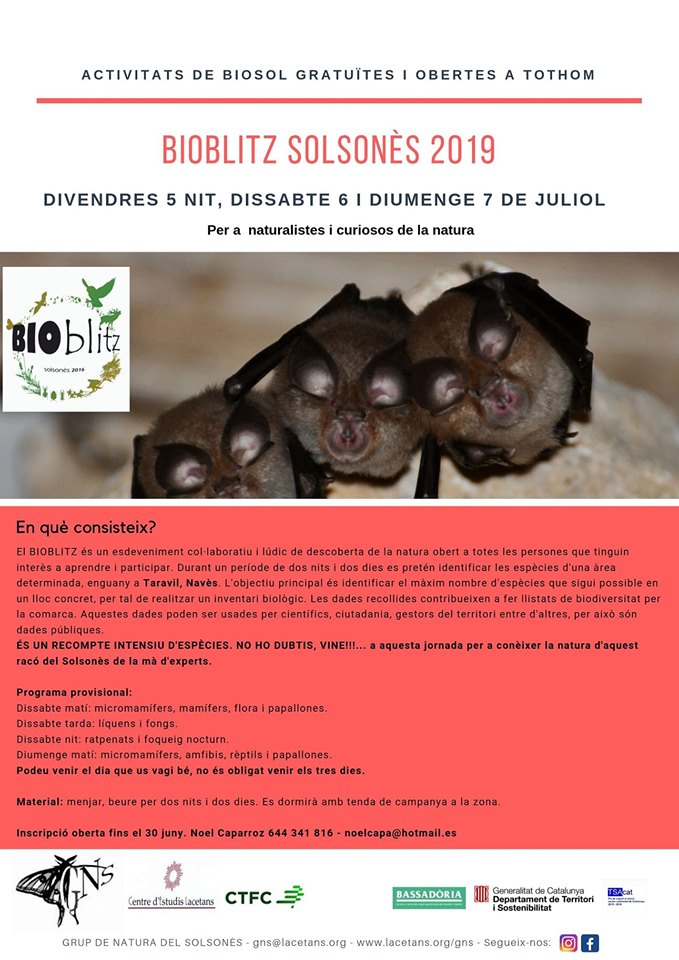 El BIOBLITZ és un esdeveniment col·laboratiu i lúdic de descoberta de la natura obert a totes les persones que tinguin interès a aprendre i participar. Durant un període de dos nits i dos dies es pretén identificar les espècies d’una àrea determinada, enguany a Taravil, Navès. ÉS UN RECOMPTE INTENSIU D’ESPÈCIES. NO HO DUBTIS, VINE!!!… a aquesta jornada per a conèixer la natura d’aquest racó del Solsonès de la mà d’experts.