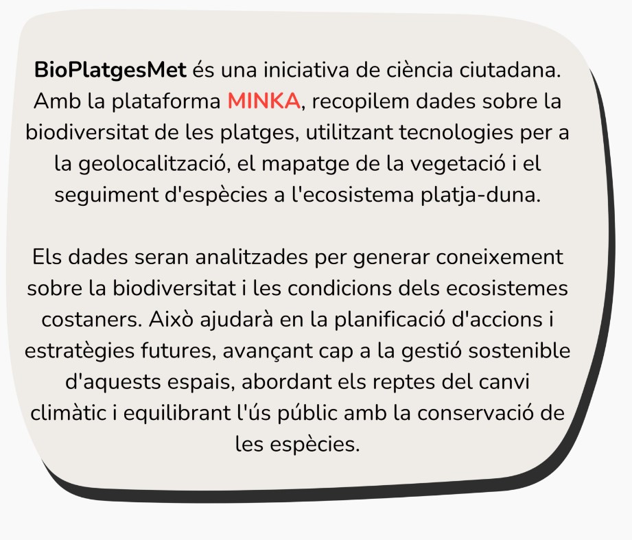 Participa del projecte de ciència ciutadana BioPlatgesMet, puja les teves observacions a la plataforma Minka i ajuda’ns a protegir la biodiversitat a les nostres platges!