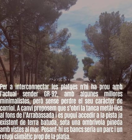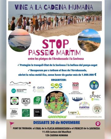 30 de novembre 11:45 h, entre les platges de l’Arrabassada i la Savinosa per dir NO a la construcció d’un passeig marítim en aquell indret i per demanar l’accés al bosc del recinte del Preventori perquè esdevingui un espai per a la ciutadania.