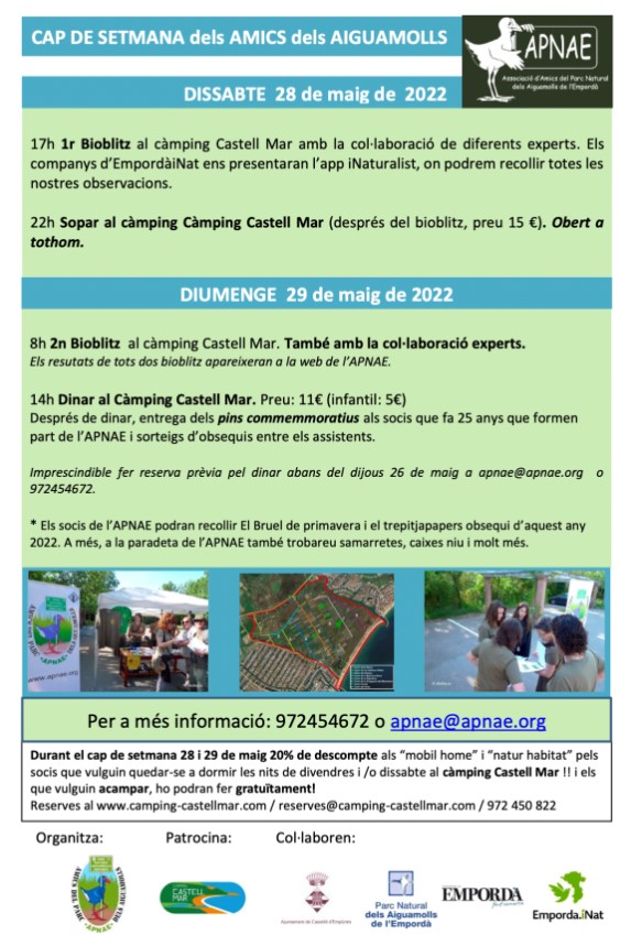 Estem preparant activitats per aquests dies entre les quals hi haurà paradeta de l’APNAE, un bioblitz que es durà a terme en 2 sessions, entrega de pins i trepitjapapers, el Bruel en paper, un sopar i un  dinar al Càmping Castell Mar.