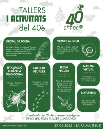 El proper diumenge 27 d’abril, el GEPEC-EdC celebrarem els nostres 40 anys amb una jornada festiva i oberta a tothom. L’esdeveniment tindrà lloc a La Palma de Reus, de 10 h a 20 h, i vol ser un punt de trobada per reconèixer quatre dècades de compromís amb la natura i de defensa del territori.