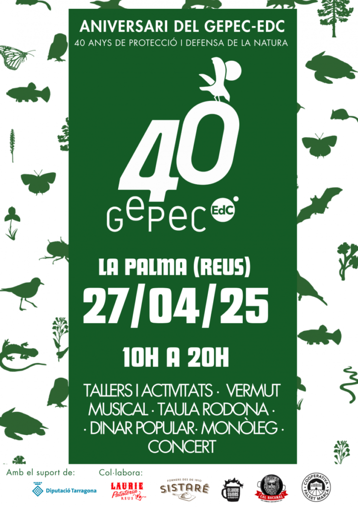El proper diumenge 27 d’abril, el GEPEC-EdC celebrarem els nostres 40 anys amb una jornada festiva i oberta a tothom. L’esdeveniment tindrà lloc a La Palma de Reus, de 10 h a 20 h, i vol ser un punt de trobada per reconèixer quatre dècades de compromís amb la natura i de defensa del territori.