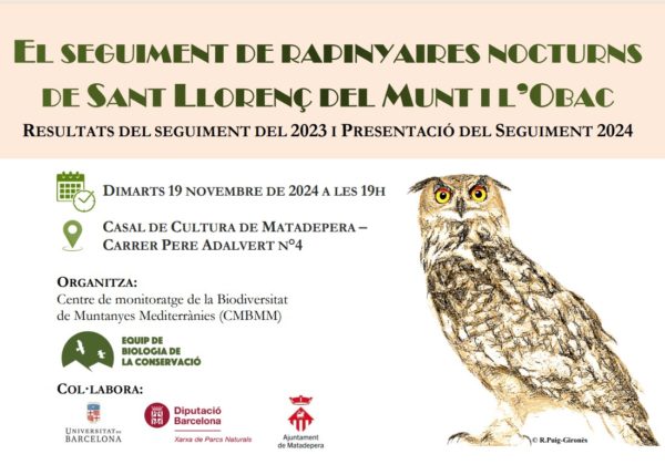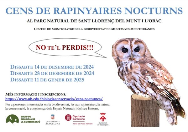 Aquest hivern, el Parc Natural de Sant Llorenç del Munt i l’Obac acollirà una nova edició del cens de rapinyaires nocturns, organitzat pel Centre de Monitoratge de la Biodiversitat de Muntanyes Mediterrànies (CMBMM) en el marc del conveni de col·laboració entre la Diputació de Barcelona i la Universitat de Barcelona.