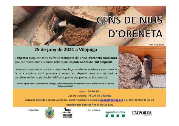 L’objectiu d’aquest cens és fer el recompte dels nius d’oreneta cuablanca que es troben dins els nuclis urbans de les poblacions de l’Alt Empordà. L’oreneta cuablanca posa els nius a les façanes de les nostres cases, això la fa una espècie molt propera a nosaltres. Aquest cens ens ajudarà a conèixer millor la població nidificant poble per poble de la comarca.