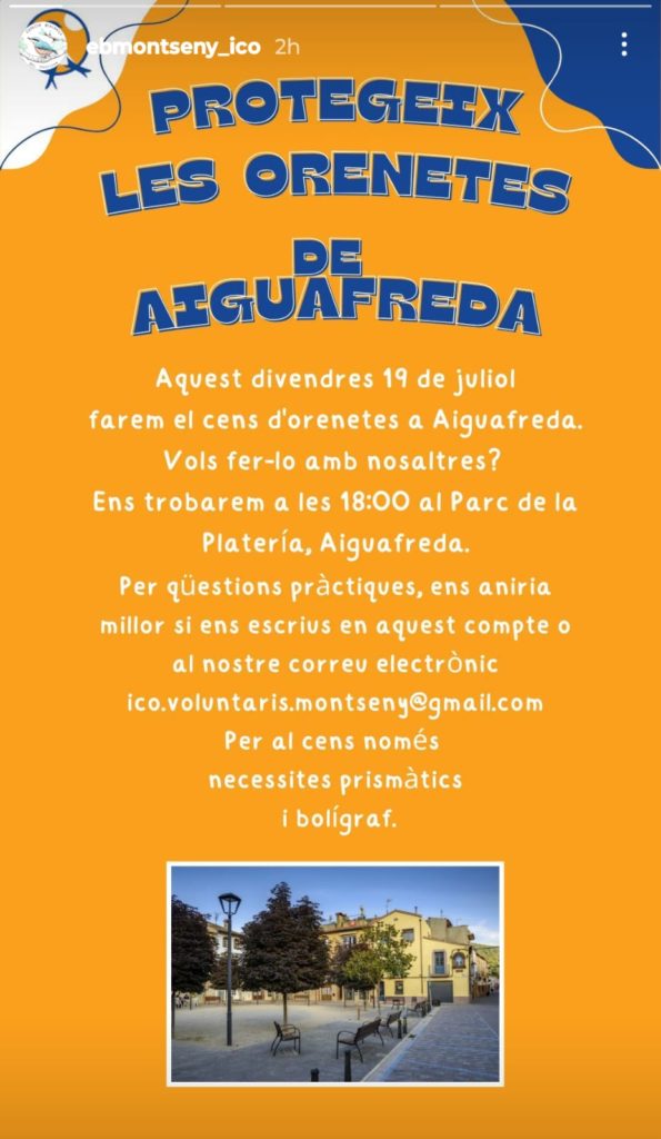 Aquest divendres 19 de juliol farem un cens d’orenetes a Aiguafreda. Vols fer-ho amb nosaltres?