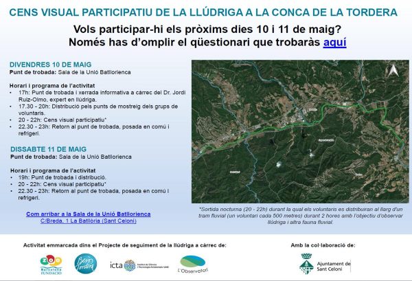 En aquest context, els propers dies 10 i 11 de maig es durà a terme el cens visual de llúdriga a la conca de la Tordera en el qual es fomenta la participació ciutadana a través de voluntaris (majors d’edat) en un projecte de recerca.