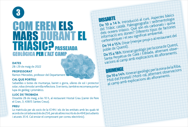 Els oceans actuals alberguen una enorme diversitat de formes de vida, però l’estudi del registre oceanogràfic fòssil ens indica que no sempre ha sigut així. En aquest curs ens traslladarem al període Triàsic (fa 250 milions d’anys) per tal d’esbrinar com eren els mars epicontinentals soms d’aquella època, quins organismes hi vivien i per què hi vivien. Explorarem el registre geològic del Triàsic preservat en forma de roques sedimentàries amb l’objectiu d’entendre de quina manera els fenòmens ambientals locals i globals varen condicionar els ecosistemes marins.