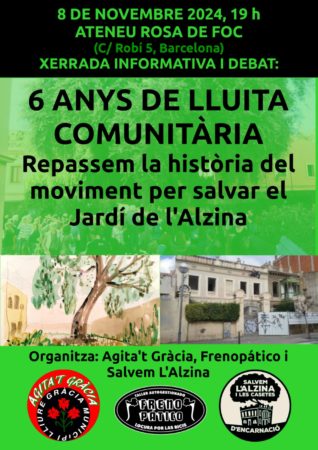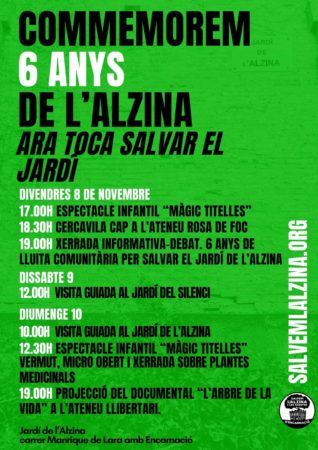 - 19.00 h: Xerrada informativa-Debat: 6 anys de lluita comunitària per salvat el Jardí de l’Alzina. Lloc: Ateneu Rosa de Foc, carrer Robí, 5)