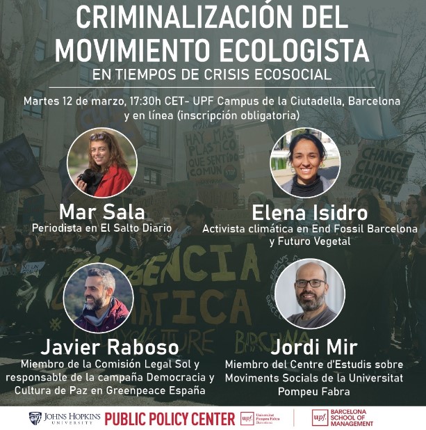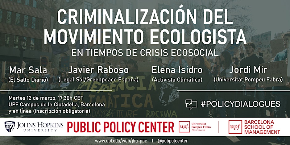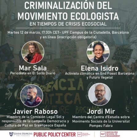 Estos acontecimientos subrayan la urgente necesidad de abordar la criminalización del activismo ecologista y explorar estrategias para proteger los derechos civiles. Por este motivo, el JHU-UPF Public Policy Center presenta el próximo Policy Dialogues: “Criminalización del movimiento ecologista en tiempos de crisis ecosocial”. En esta sesión, se explorará el tema desde diversas miradas y experiencias, incluyendo las del activismo, periodismo, derecho y política. Se buscará comprender las causas estructurales y políticas de la represión, así como sus implicaciones para la sociedad y la democracia.