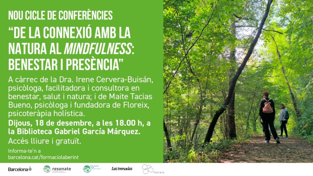 Ponents: Dra. Irene Cervera-Buisán (Psicòloga, facilitadora i consultora en benestar, salut i natura) i Maite Tacias Bueno (psicòloga i fundadora de Floreix, psicoteràpia holtística), ambdues membres del Resilient Hub de l’Institut de Salut global de Barcelona, impulsat pel projecte RESONATE. L’activitat forma part del cicle de conferències del Centre de Formació del Parc del Laberint de Barcelona.