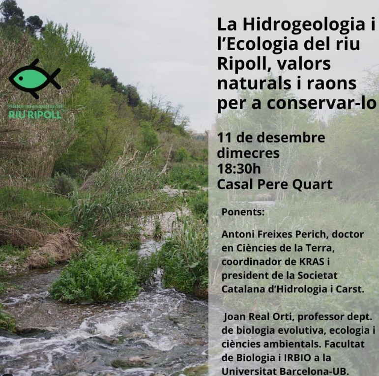 El dimecres dia 11 de desembre al casal Pere Quart de Sabadell a les 18:30h parlarem de la hidrologia i l’ecologia del riu Ripoll, valors naturals i raons per a conservar-lo.