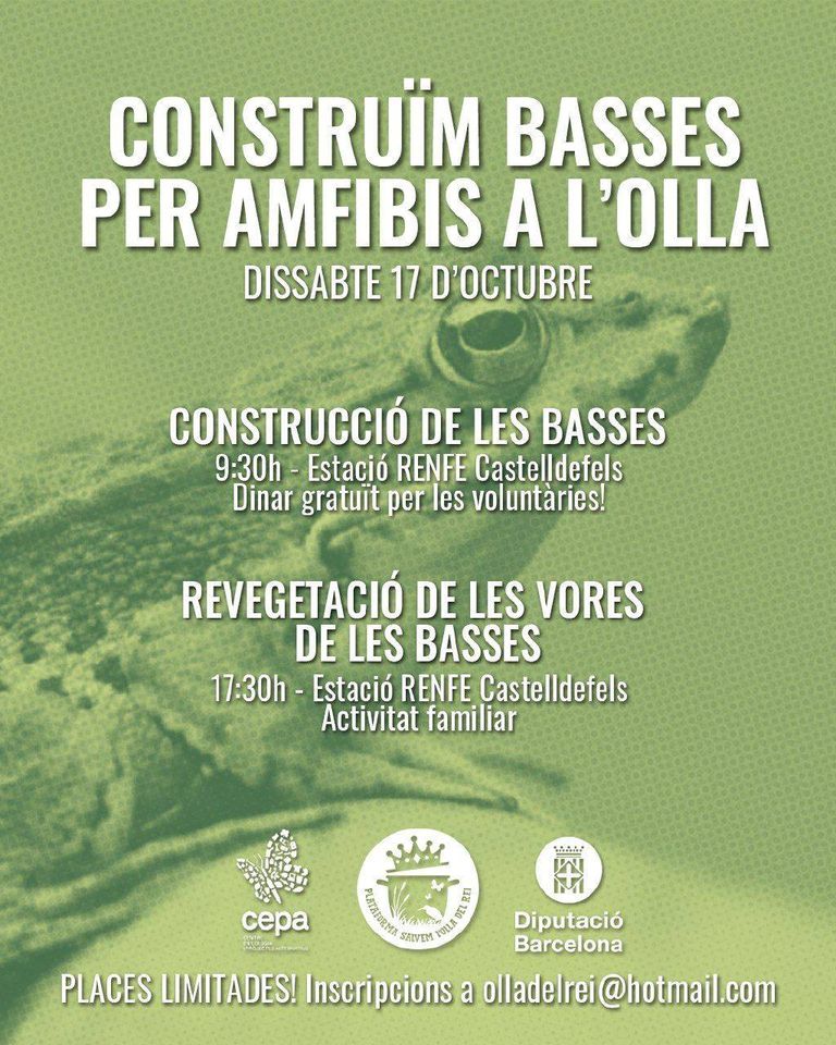 Anunciem una acció pel dissabte 17 d’Octubre a l’Olla del Rei. Es tracta de la construcció d’una bassa per amfibs (les espècies més amenacades) i revegetació de l’entorn de la bassa. La bassa s’alimentarà d’aigües pluvials netes i servirà per donar espai de cria i aixopluc per als amfibis que arriben a l’Olla del Rei. (Podeu veure les fotografies d’un acció semblant duta a terme al Riu Gaià.)